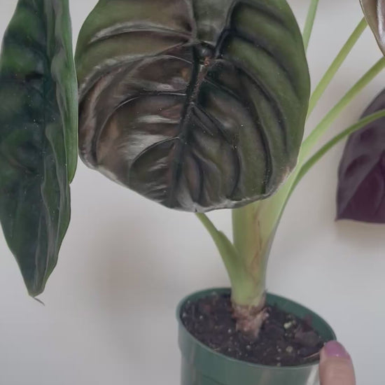 Alocasia Cuprea ‘Red Secret’, takes its name from the metal copper as her leaves shine with reddish undertone when exposed to bright light. Large egg-shaped leaves with deep ridges will make it a centerpiece of any collection. The undersides of the leaves are maroon. ‘Red Secret’ is a smaller Jewel Alocasia only growing 12-18” tall making it a perfect plant for a partially sunny windowsill. It grows best in warm temperatures and high humidity: keep the soil evenly moist and fertilize during the active growing season.