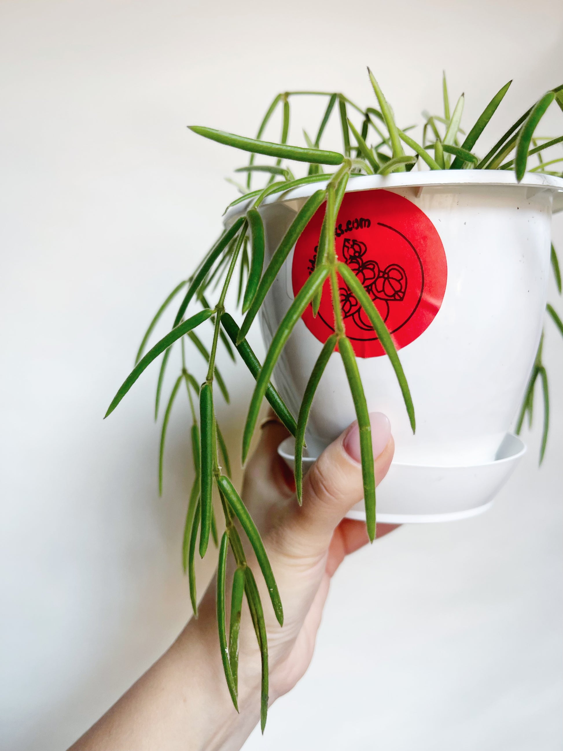 Hoya linearis is a unique hoya from the Himalayan region of Northern India. Unlike other plants in the genus, H. linearis is not much of a climber. Rather, it takes root in the crevices of trees and hangs gracefully from their branches. The leaves are small, thin and covered in a light fuzz. White, star-shaped flowers appear in clusters and smell delightfully of lemon. It has a reputation for being one of the hardest hoyas to grow. It needs to be kept in a humid environment, but it is quite sensitive to overwatering.