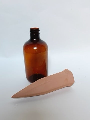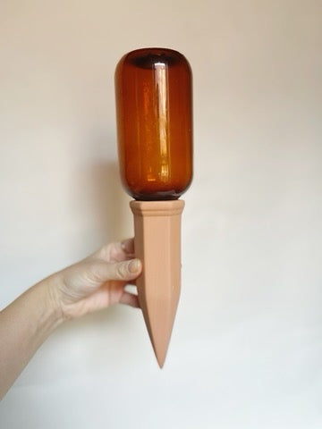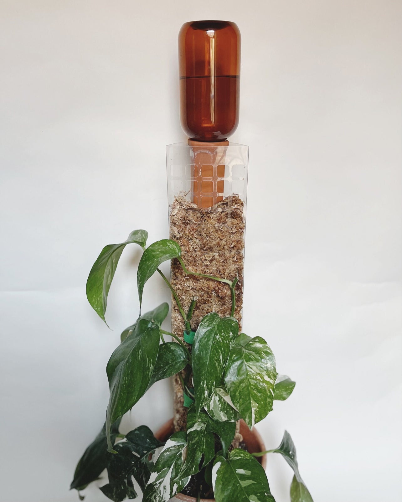 A terracotta stake + a watering bottle kit provides a hustle free watering for your moss poles. Simply fill the bottle up and flip it over: the stake will do the rest and will evenly distribute moisture through the moss.